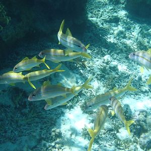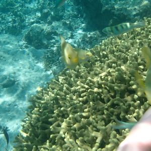 今までに数ヶ所でシュノーケリングの経験があるのですが、こちらのポイントは水深が浅くて海底までよく光が入って明るいし、珊瑚や魚も近くで見れるところがいいですね(^^)。魚のサイズは小さいですが、人になれてるみたいで(餌付けがいいことなのかは別にして…) 積極的に近寄ってきて何度も指をつつかれました(^o^;)