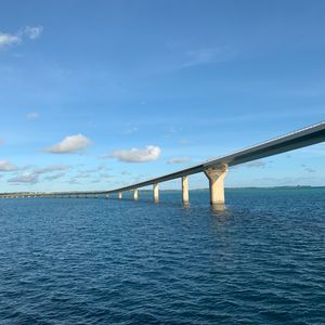 急に天候が悪くなり波が高くなったところコース変更で伊良部大橋の下を潜ってくれ、橋が一望出来出来た。