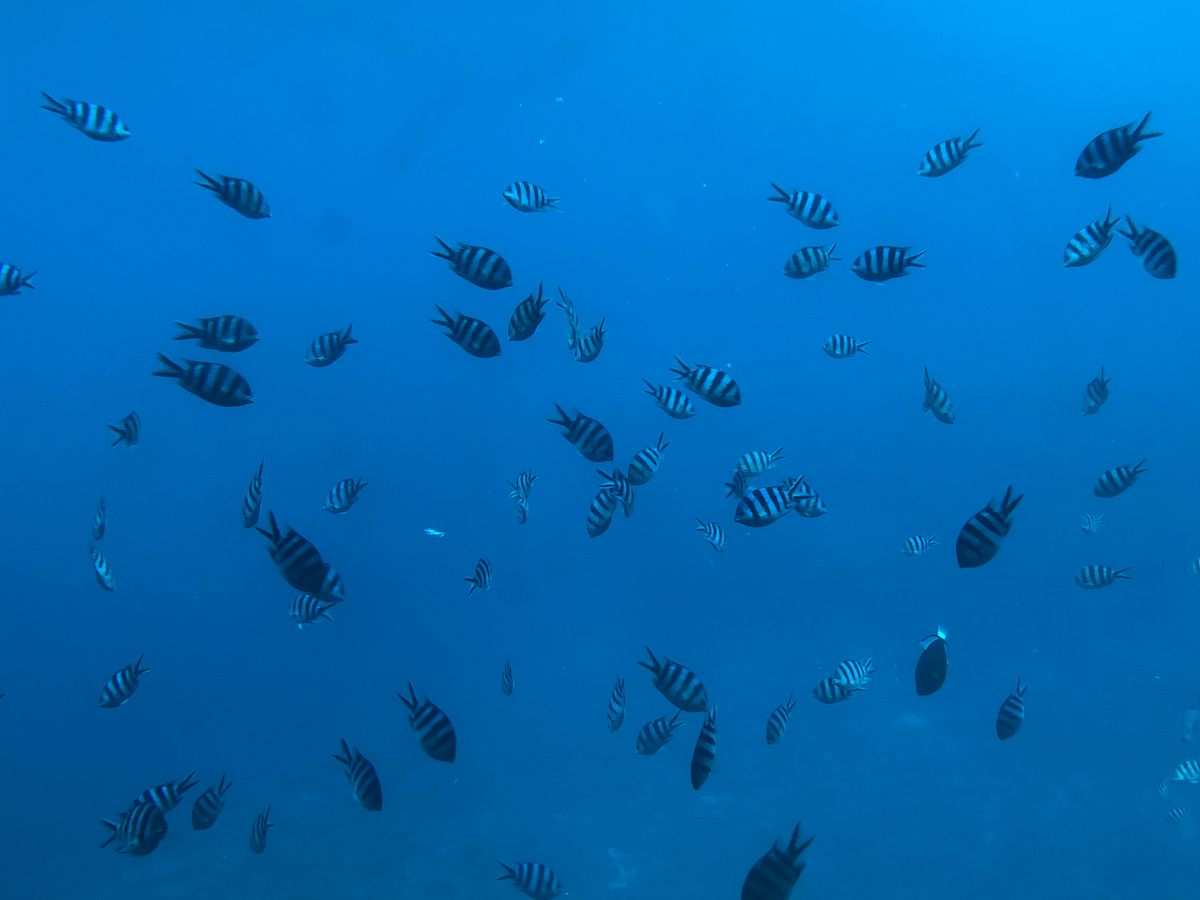 おそらく船の大きさから、サンゴ礁の上を通過することが出来ず、少し浅瀬で上からエサを撒いて魚を集めてたように感じました。