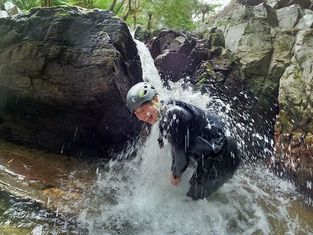 寒いのが嫌いな妻は、最初はずぶ濡れになる事を極端に怖がっていましたが、一度、水に入ったら覚悟が決まったようで、一番奥の滝壺では寒さを忘れ泳いだり、飛び込んだりしてました。