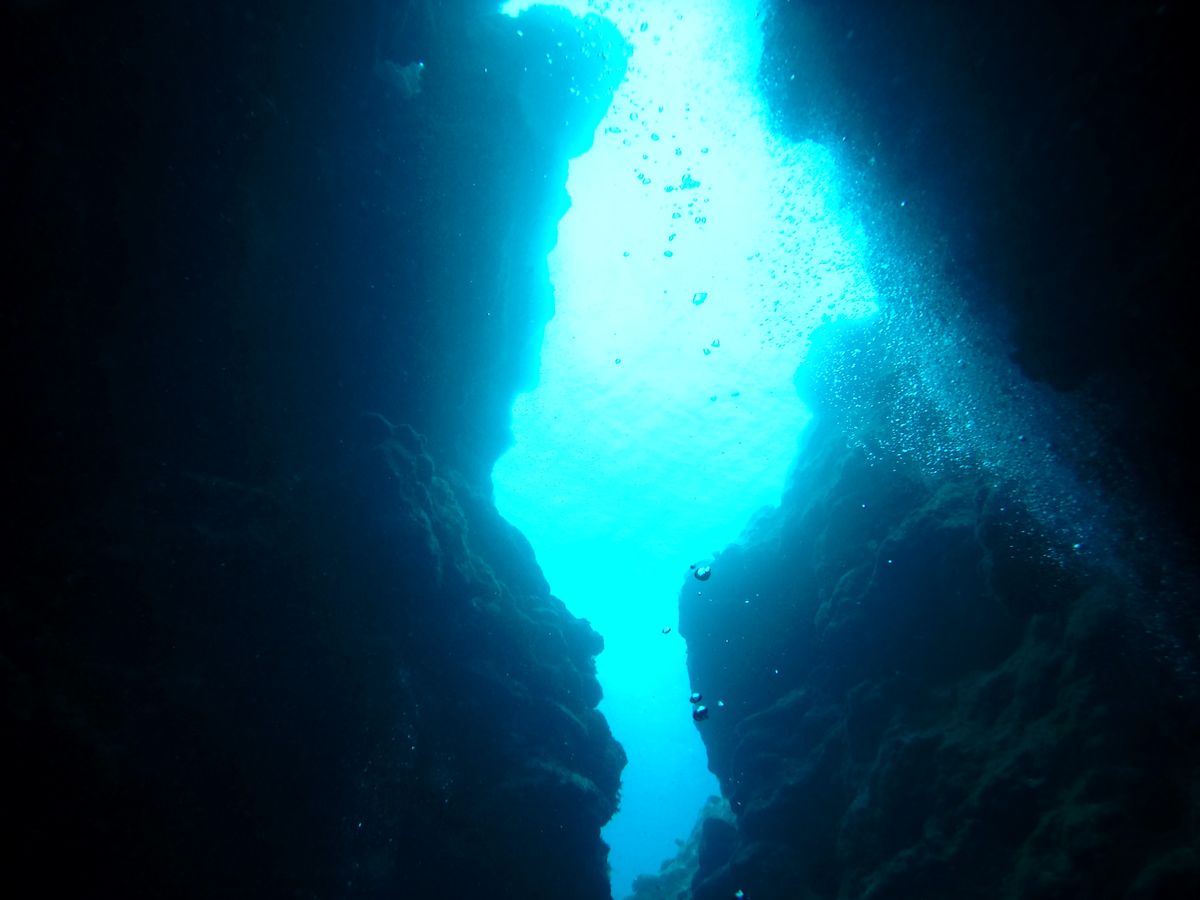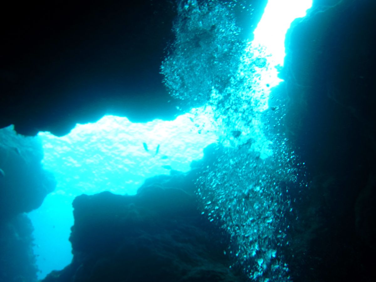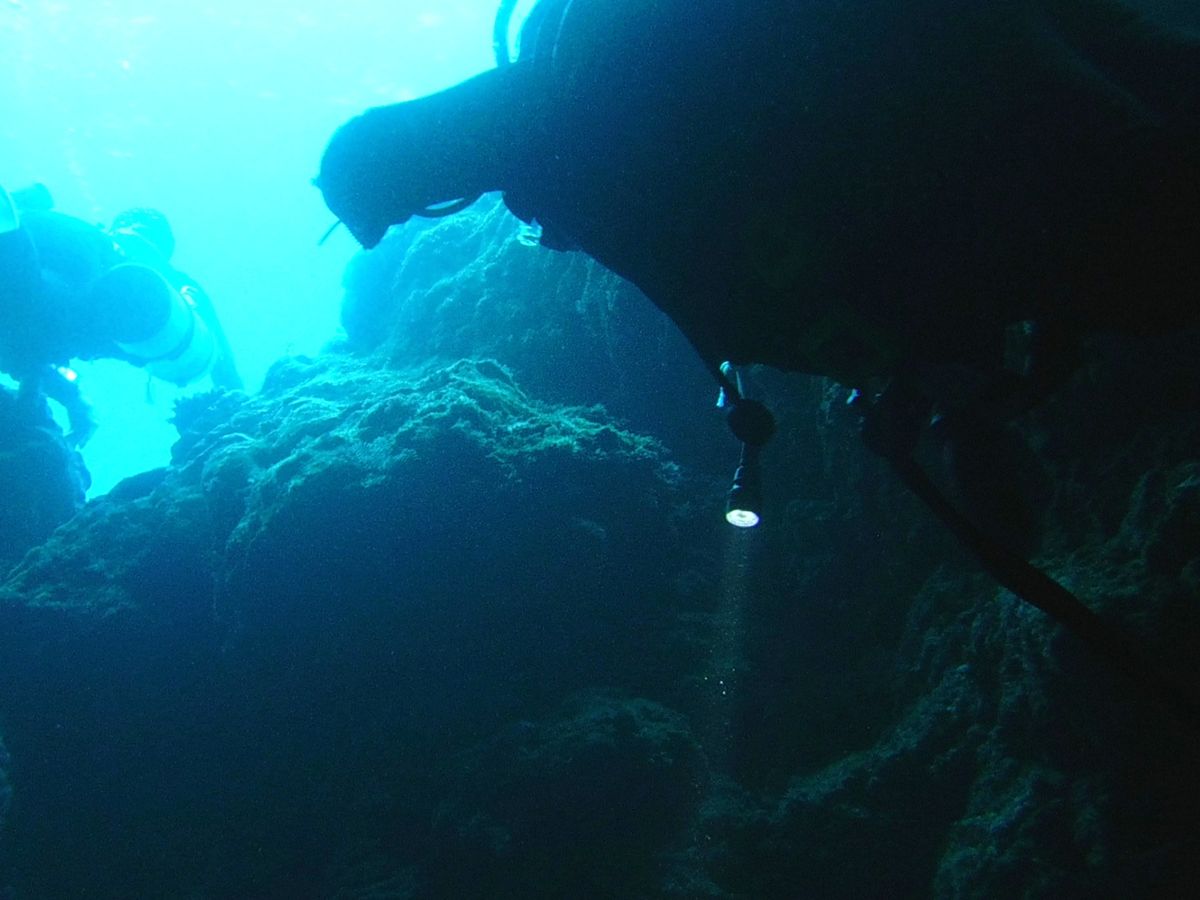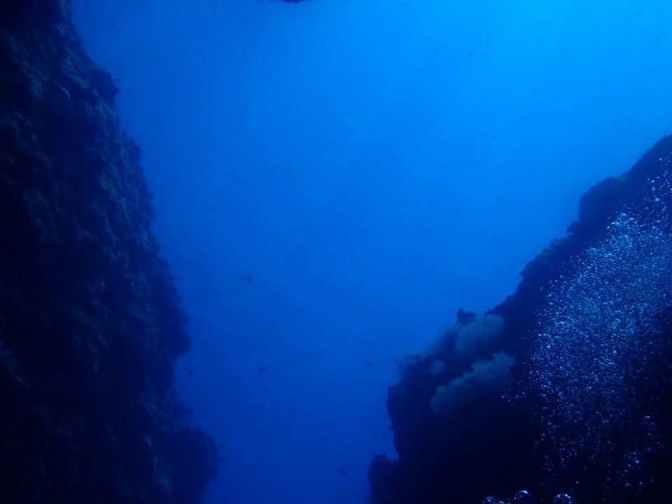 二本目と三本目は中の島チャネルとなるほどザケーブ。地形ダイビングは初めてでしたが、感動の連続でした。あいにく天気がどんよりしていたため、岩の間にから差し込むビーム光線は見れませんでしたが、月明かりのように差し込む青い光にただただ圧倒されました。