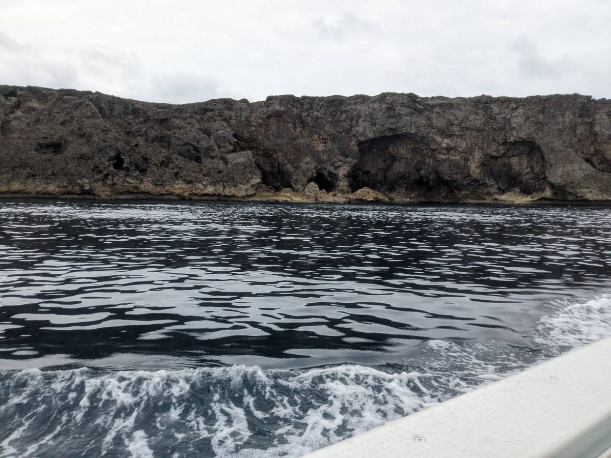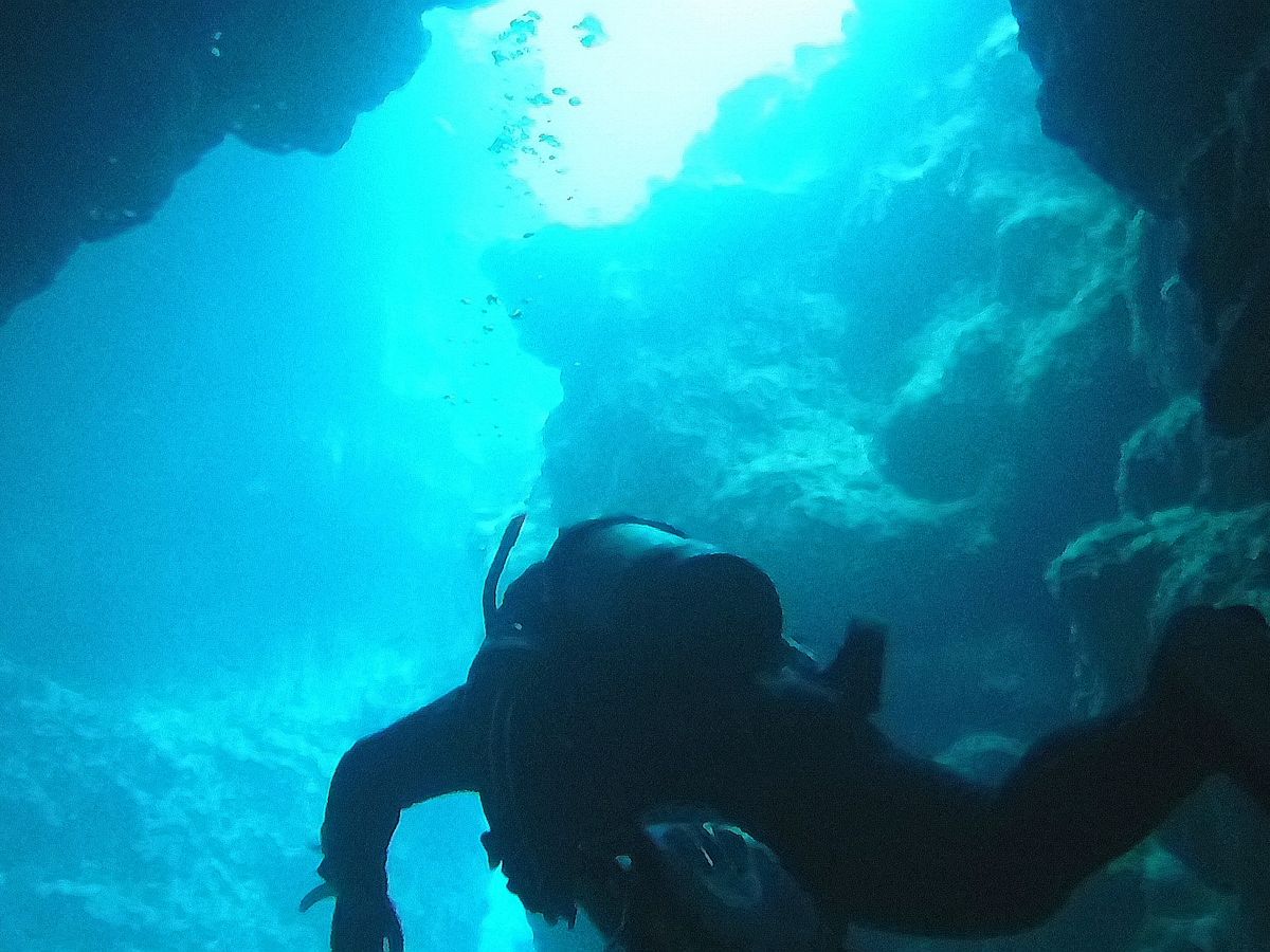 天気は曇りで光が十分ではなかったものの洞窟のような穴の中を進むことが多く、洞窟のなかから見上げる海がとてもきれいで、洞窟のなかには魚もたくさんいて楽しかったです。次は光が水中までたくさん差し込む晴れの日に潜ってみたいなと思いました。