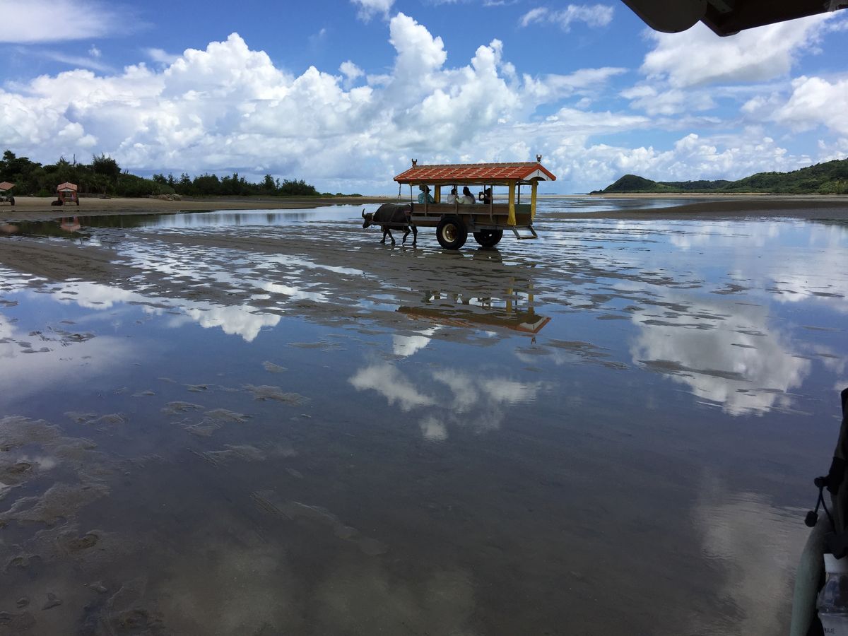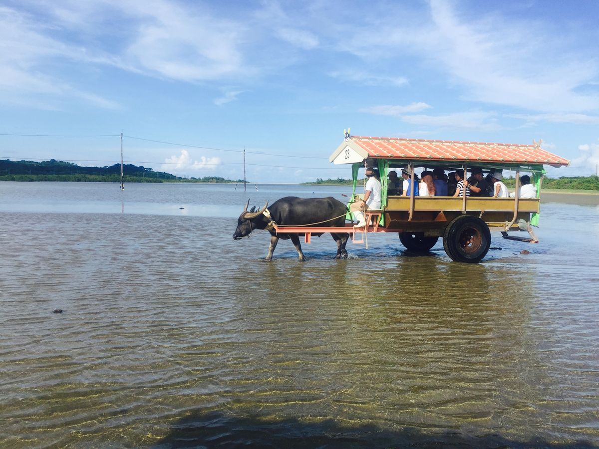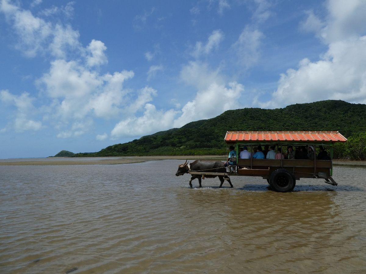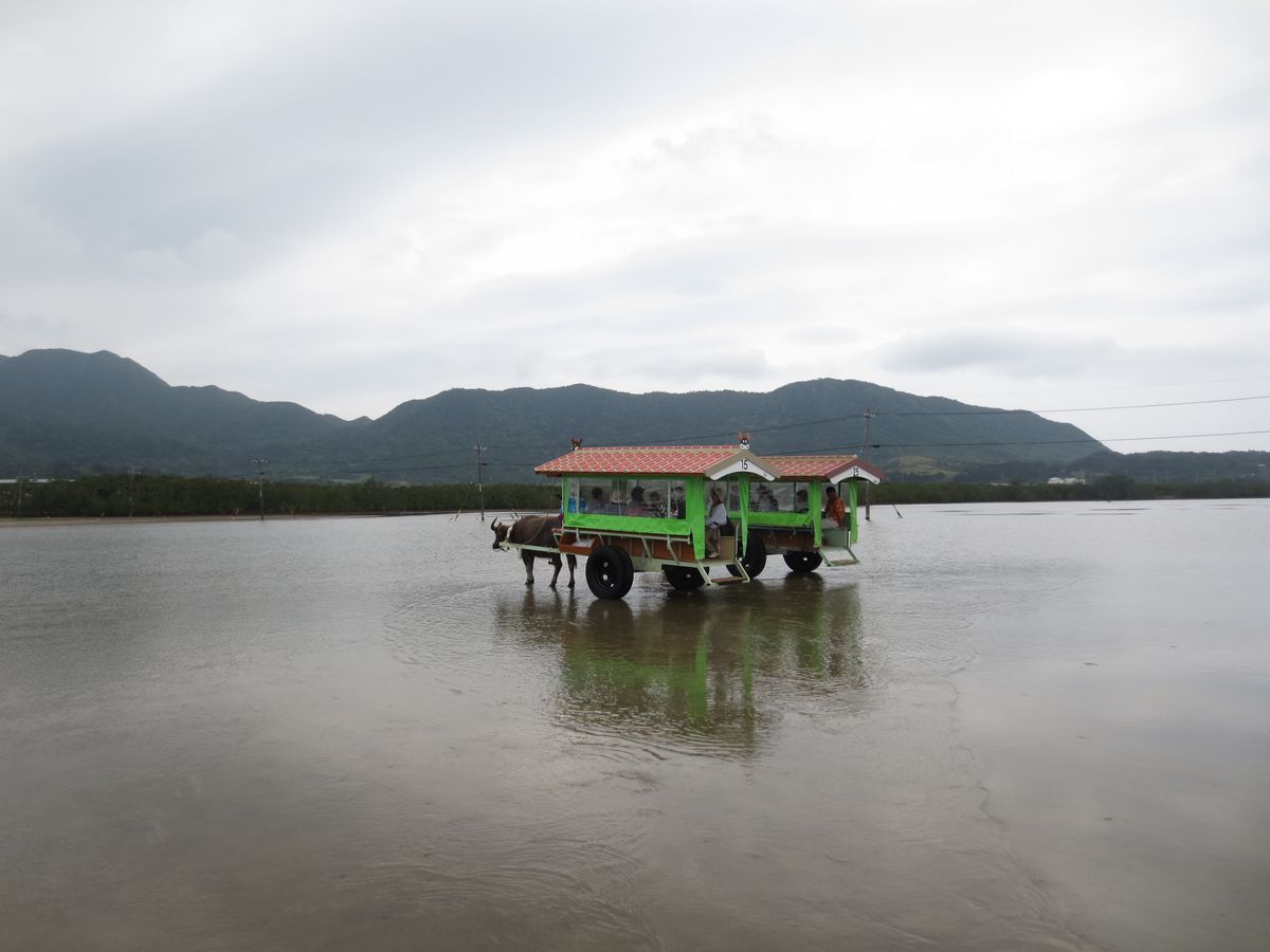 台風前の7月4日に友人二人で参加しました。一番のイケメン水牛 「ゆうじろう」 に乗車し、由布島へ。植物園になっている島を散策し、前日泊まった小浜島を眺めながら泡盛のジェラートを食べて休憩し、水牛プールで涼をとっている赤ちゃん水牛を見て癒された後。長老の水牛(名前は忘れちゃった)の車に乗って戻ってきました。
