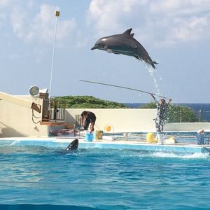 美ら海水族館では、イルカのオキちゃん劇場は見るべき。早目に行く方がいい席を取れますよ。