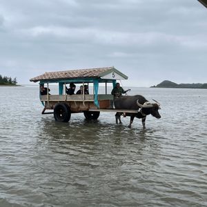 遠浅の海の中を水牛に引かれてゆっくりと進んでいきます。もちろんここは絶景!