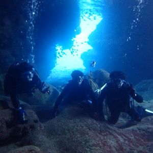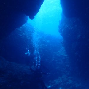 海底の岩場の洞窟をくぐる緊張とそこで見えた海底に差し込む光、魚たち、そしてインストラクターの女性、想像してください。