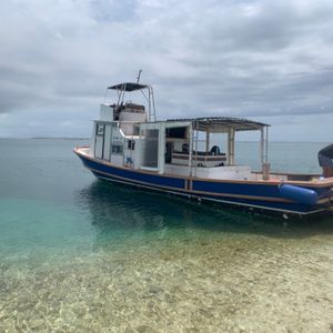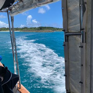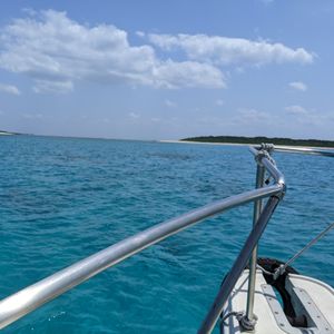前日海が荒れたため、船着き場に船が停められないようになっていて、泳げなかったのは残念でしたが、クルーザーは貸し切りで、舳先に乗せてもらい、透明な海を眺めることができました。360度見渡す限りの大海原をひとり占めしながら進むのはとても爽快でした。