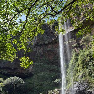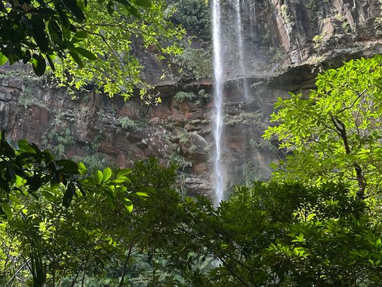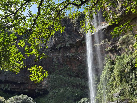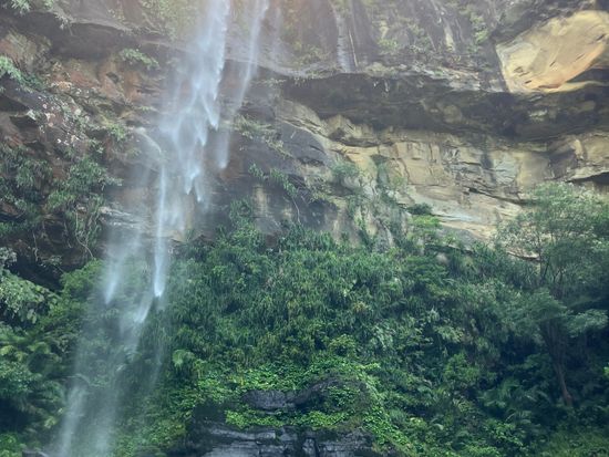 滝上を見上げると50mの高さからかなりの勢いで落ちてくる迫力に圧倒されます。