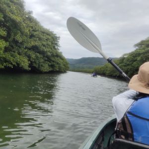 石垣島から上原港へのt直通の船が高波で欠航し、大原港経由でフェリー会社のバスで上原港に1時間遅れでの到着となってしまいましたが、臨機応変にスタートを1時間繰り下げてご対応くださいました。カヌーは初めてでしたが、「慌てないで大丈夫ですよ」と声をかけて下さるので、肩に無用な力も入らず、川岸の神秘的なマングローブの景色を楽しむことができました。カヌーを降りると滝までトレッキングです。狭い山道ですが、私たちにあわせたペースで進んでくださり、ときどき立ち止まっては周りの植物や水辺の生き物説明を交えて下さるので、汗だくになることもなく、快適に最後まで歩を進めることができました。神秘的な「もののけの森」や大自然の滝に感動し、また普段都会で暮らしている私たちが、自分の足で歩いて見に行くことができたことにも、とても驚いています。経験あるツアーガイドさんの上手な導きのおかげです。本当にありがとうございました!