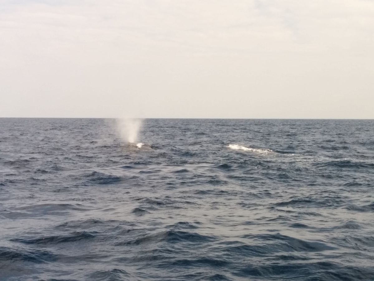 小一時間くらい白黒2頭のクジラのブローやらテールスラップやらブリーチングいろんなパフォーマンスを見せていただきました。