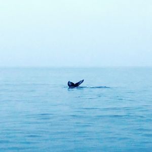 時間的にもギリギリぐらいのタイミングで、奇跡的にクジラと出会う事ができました。少し距離はありましたが、2頭のクジラがいるようで、ブローとフルークアップを見る事ができ、スタッフさん含め興奮のひと時となりました。