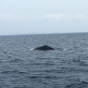 どこまで行ってもクジラには遭遇できず、沖のあたりをあちこち周り、ほかの船からの情報を元に、近くに行ってみると、クジラの潮吹き、尾ひれを振る姿が遠くに確認することができました。しかし写真等を見て想像していたのとは違いました。なんといってもクジラまでの距離が遠く過ぎるので双眼鏡等を持参したほうがいいです。なおカメラで撮影するにも一瞬でしか姿を現さなかったのでシャッターチャンスを逃さないようにカメラは常に構えていたほうがいいです。ガイドさんのお話はとても分かりやすく解説してくださりました。途中クイズを交えながら楽しいひと時を過ごすことができました。私の相棒がクジラ博士のバッジを二つも獲得できましたよ。