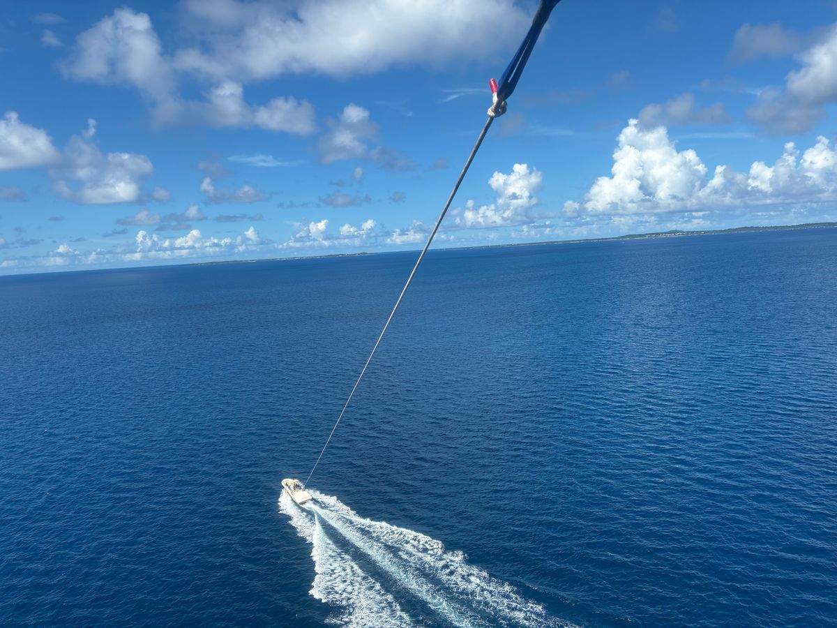パラセーリングを体験し、空から景色を眺める貴重な時間を過ごしました。ボートに引かれて高度が上がると最初は少し緊張しましたが、安定して浮かぶと安心感があり、風を直接受ける心地よさを強く感じました。上空から見下ろす海はとても澄んでいて、太陽の光に照らされて一面が明るく広がり、その美しさに圧倒されました。遠くには街並みや島がはっきりと見え、普段では得られない広い視野で景色を楽しむことができました。空中は思った以上に静かで、時折聞こえる風の音だけが響き、とても落ち着いた気分になりました。パラセーリングは怖さよりも爽快さと解放感が大きく、自然の景観を存分に味わえる素晴らしいアクティビティだと思いました。