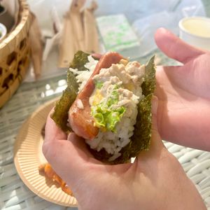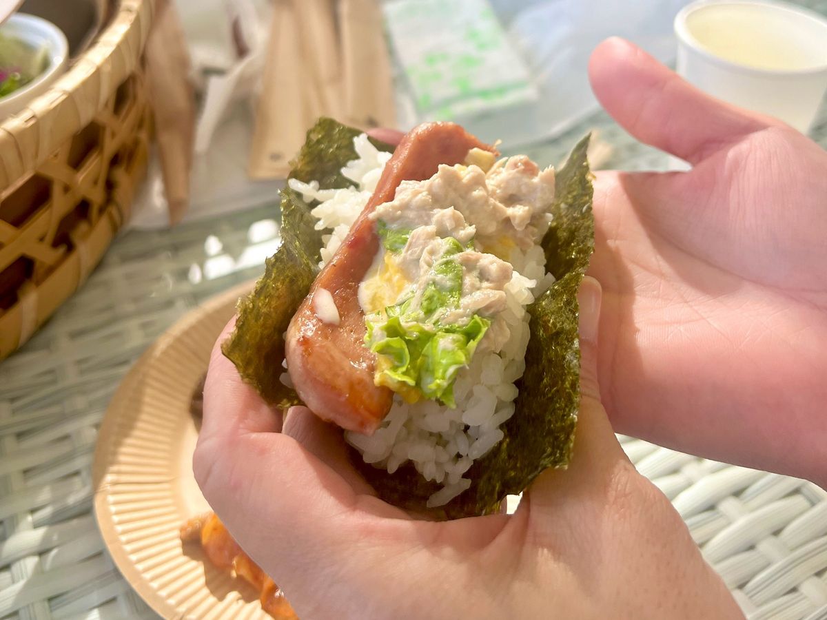 メニューは卵、ツナ、ポーク、ウインナー、もずく、豚キムチなどのおかずとご飯を自分で巻いて