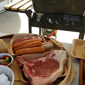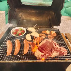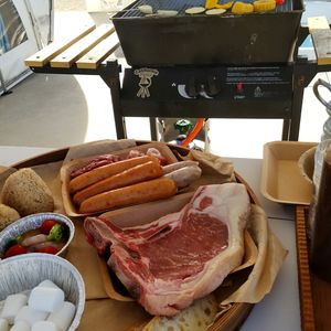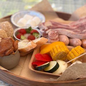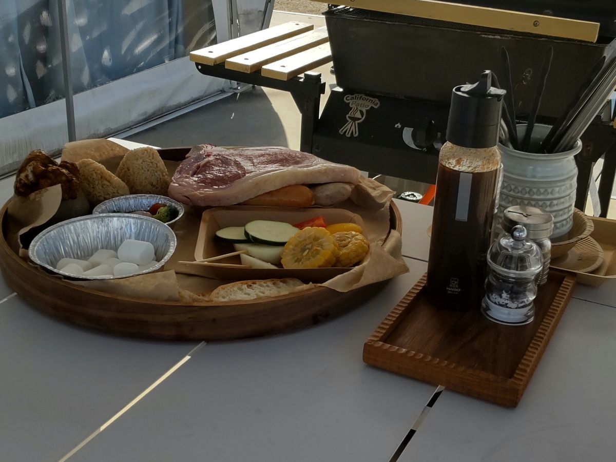 Lボーンステーキ、大きいソーセージ2種、アヒージョ(えび、ブロッコリー、トマト)、タンドリーチキン、豚の大きいお肉(サムギョプサル的な)、バゲット、マシュマロ、お野菜、焼きおにぎり