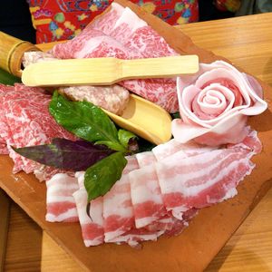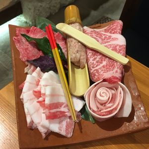 アグー豚と石垣牛のしゃぶしゃぶコースでした。前菜、島野菜の食べ放題、一品料理のメンチカツ、デザートはマンゴーシャーベットでした。前菜の三種はどれも沖縄っぽくてよかったです。しゃぶしゃぶを1番楽しみにしていたせいか、お肉は量が少なく物足りなく感じました。味はとっても美味しかったです!〆の雑炊ですが、味が少し薄く感じましたが、シークワーサーポン酢との相性がよくスッキリしてました!島野菜はたくさん種類があり、沖縄で知った野菜もありました。種類豊富かつ食べ放題で満足でした!