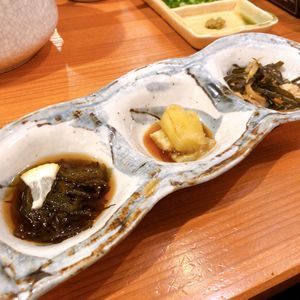 前菜3品(焼きなす・昆布の煮物・もずく)は無難なラインナップ。