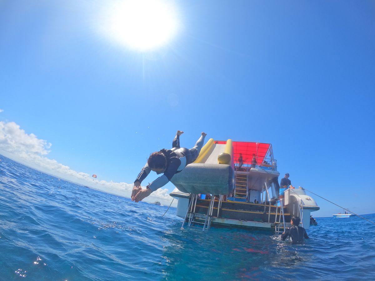 慶良間に対する期待値が高かったのか、ダイビングを若い頃やっていたからなのか、海の綺麗さにはいまいち感動ってモノがなかった…宮古島の方がやっぱり海の綺麗さはうわっまっているかな?!船の2階から飛び込んだり、船にスライダーが付いていたのは良かったね! もっとガイドさんによる海の生き物紹介があっても良かったかなぁ〜ほとんどフリーでやっていたので。参加人数が多いので1人のガイドに10人弱だと仕方がないか…