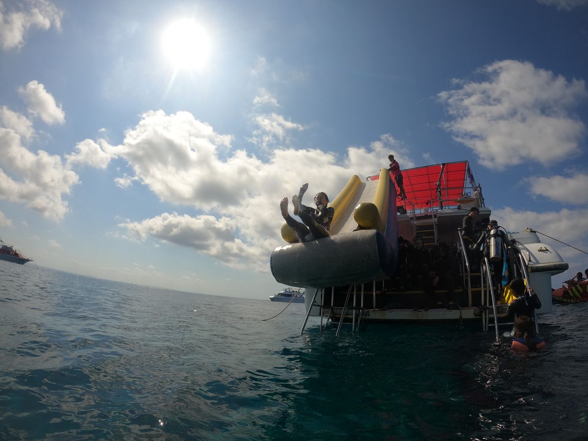 慶良間諸島でのシュノーケリングは台風のため中止になりましたが、代わりに中部の沖でのシュノーケリングに変更になりました。船までバナナボードで連れて行ってくれたのすごく良かった!2倍楽しめた感じでした。ダイバーさんはずっとついててくれたのでアンジェスだったし、終わった後、ホテルのプライベートビーチでアクティビティ付きを無料で使わせていただいたので滑り台など子供に返った気分で遊べました。シャワーもホテルのものを使わせていただいたのでシャンプーリンス、ボディーシャンプー完備で至れり尽くせりでした。またしたいです。