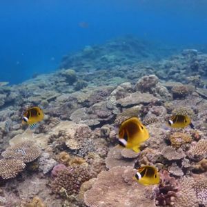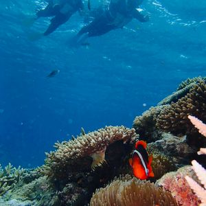 海の透明度がとても素晴らしいし、死んでるサンゴ礁がないのにはびっくりです。足に何かが当たったので見てみると、サンゴ礁でした。浅いところにもありとにかくきれいでした。ガイドさんの写真の撮り方も最高で、一生ものぐらいの素晴らしい思い出の一枚が取れました。それと船が新しくて設備が整っていてきれいですばらしかったです。