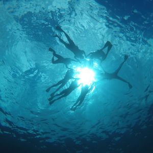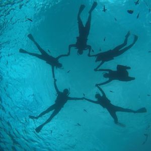 ボートからジャンプしたり、水面で皆で手を繋いで円を作ったりと、