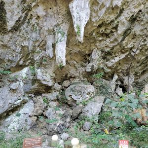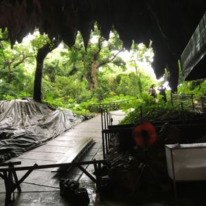 玉泉洞バス停に着いた時には晴れていたのですが、ツアー集合場所のケイブカフェには、早朝に降った雨に押し出されたという雨がたくさん降っており、カッパを着て参加しました。