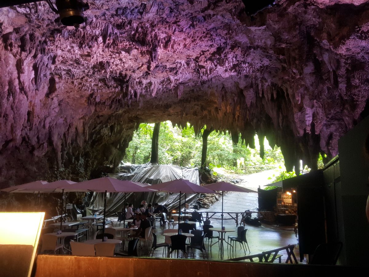 まず、入り口前にはケーブカフェという洞窟内のカフェがあり、そこには天井から鍾乳洞の雫が落ちてくるので、パラソル付きのテーブルと椅子があり、雰囲気がすごく良かったです。その後、1グループ10名くらいの参加者に対して事前の説明がありました。虫除けのジェルがあったのでみんな塗っていました。ほぼ県外の方でした。ツアーは約一時間くらいだったと思いますが、洞窟からジャングルに入ったような感覚になり、大きな竹やマングローブ、サトイモの葉っぱが大きくなったものなど、普段見ることのできないような世界が広がっていました。歩いていくと、女神の鍾乳洞があり、そこで拝みました。その後、一人一個ランプを渡されて、暗い洞窟の中に入っていき、男神があったので、そこでその鍾乳石に触れ、拝みました。そして、トンネルを抜けると大きなマングローブの木があり、そこでみんなガイドの方から記念写真を撮ってもらってました。歩いていくと、木の上のツリーハウスに登っていき、展望台のように眺めがよく、見晴らしがよかったです。