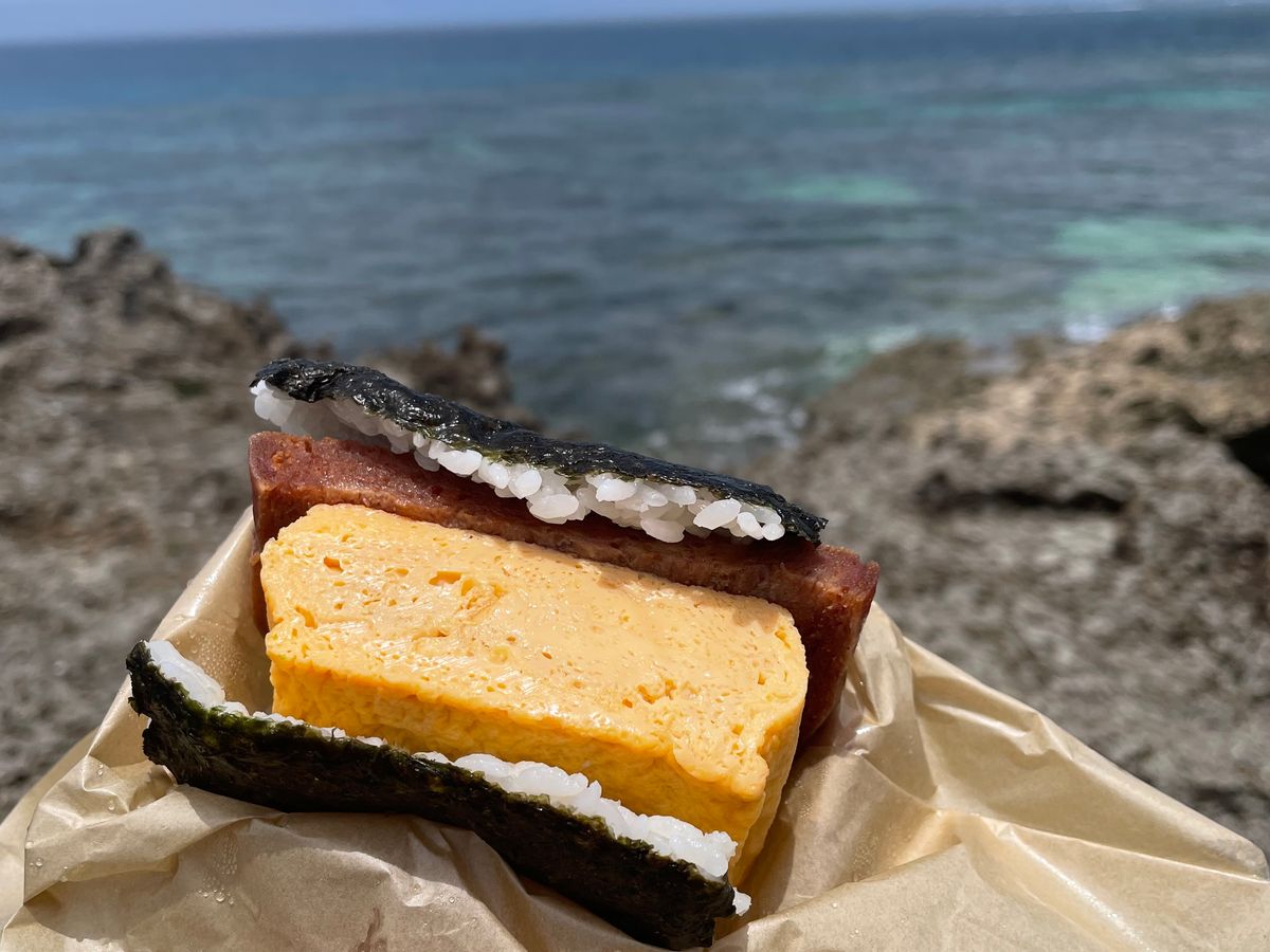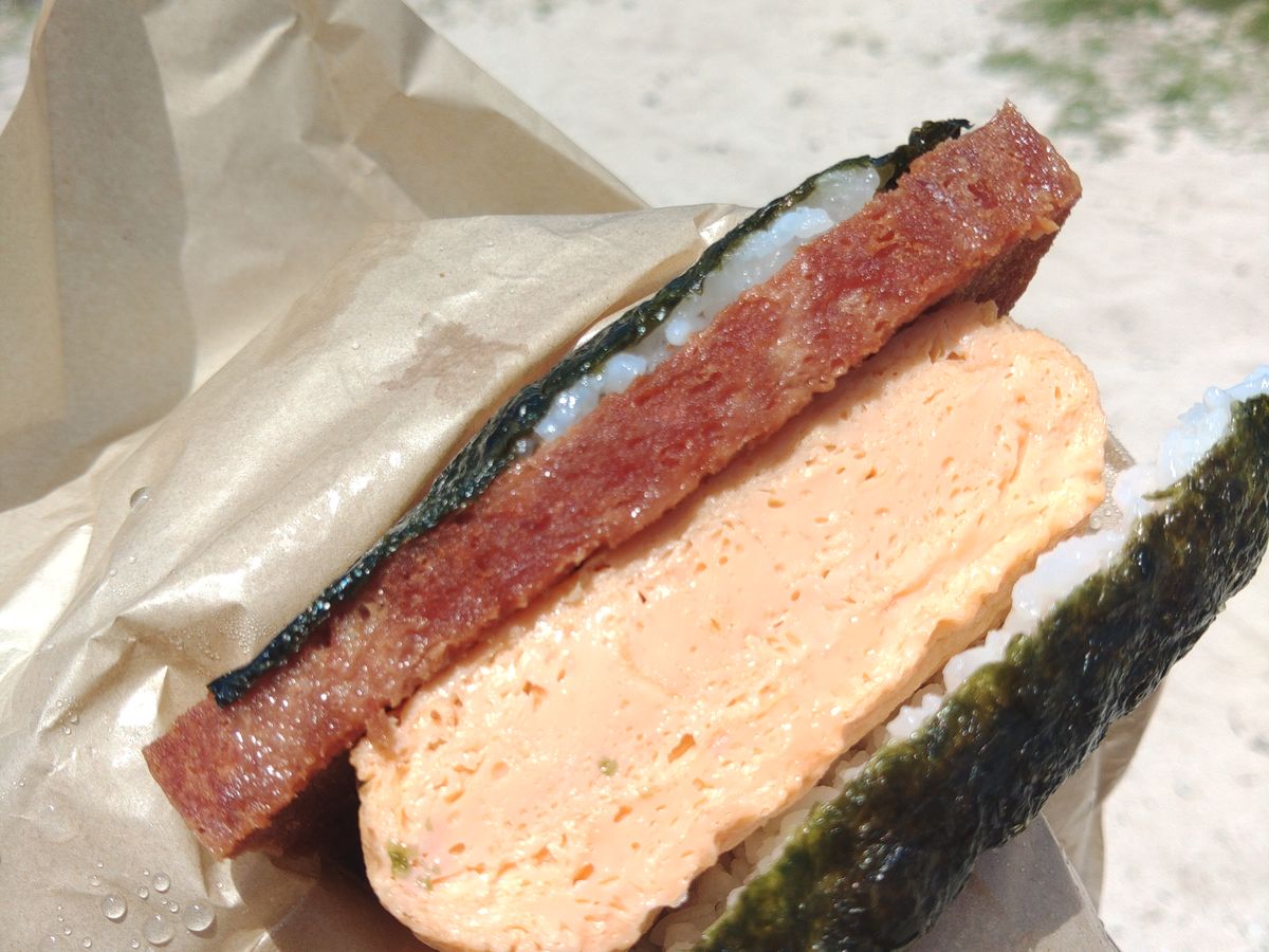 厚焼きポーク玉子おにぎりはあたたかいうちにフェリーの中でいただきました。(…が、後になって、実は『船内飲食禁止』であることを知りました。説明も掲示もなく…。入港後すぐに観光があり荷物になると思って片付けたのですが、それならいっそ配布なしの方が良かったです。)