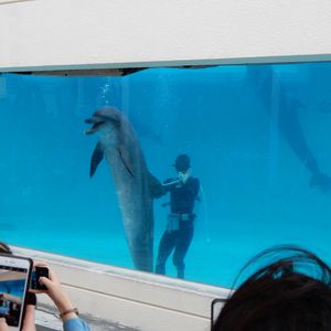 美ら海水族館では、イルカに水を大量にかけられてずぶ濡れになりました。写真もバッチリ。