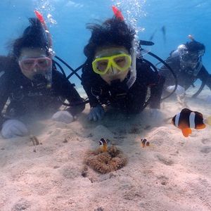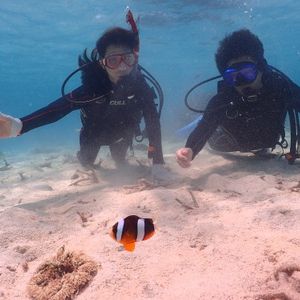 GW中に利用。午前中のコースで当日は私たち2人だけでした。時間どおりにホテルまでピックアップに来ていただき、港から出航。幻の島は本当に遠浅で神秘的な場所でした。写真をとって、すこしフリータイムのあと、ダイビングの講習が始まりました。来る前に風邪を引いて咳がひどかったので、今回はできないかも、とほとんど諦めて参加しましたが、様子を見ながらやっていきましょうということで、丁寧に浅瀬で練習。その後、スポットまで船で移動して開始!同行していた旦那はライセンス持ちのため、ほとんどマンツーマンで丁寧にフォローしてもらえました。最初は緊張とそもそも泳げないので恐怖心で息苦しくなり、すぐ上がってしまいましたが、ちゃんと指導に従ってゆっくりもう一度チャレンジし、3メートル程度の海底まで潜れました!都度、状態を確認してくれて、30分ほどきれいな魚たちを楽しむことができました。ダイビングは泳げなくても大丈夫と聞いていましたが、本当でした!感動です!また違う場所でも潜りたいと思わせていただきました!!私のように不安な方にもとってもお勧めできます。