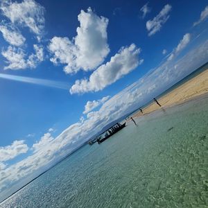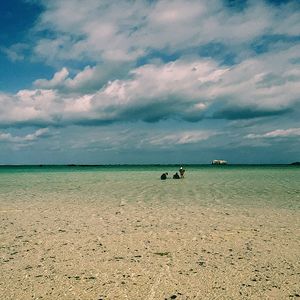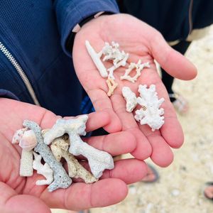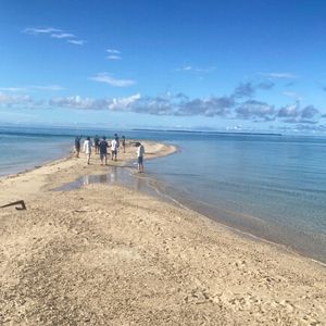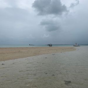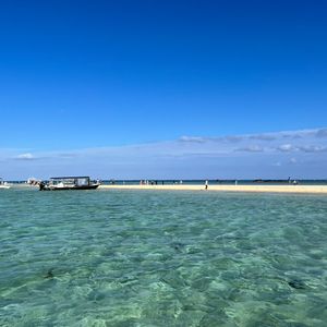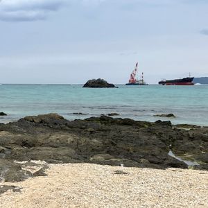 朝一番のツアーに参加しました。まだ他のツアー客も居なくて私達のツアーが初上陸でした。上陸のみのツアーにしてましたが水着を上下とも着てその上から上着を着ました。上陸時間の潮の満ち引きにもよるでしょうけど、膝上までは余裕で浸かりながら(身体163センチです)数歩だけだけど歩くので濡れます。念の為、着て行った上着とは別にユニクロのウルトラライトダウンを持っていきましたが大正解。オープンな船でたまに水飛沫が顔まで掛かって笑いながら向かいました。海開きしたばかりで寒かった。曇りだったので、空が残念な感じでしたが砂浜に足跡も無くて、海は綺麗でした。ツアーのお兄さんがフレンドリーに話しかけてくれて家族での写真も上手く撮ってくれました。珊瑚礁のかけらを拾い持ち帰りました。帰る時は他のツアーの船がたくさん来て、人だらけになった幻の島でした。座礁した船が半分くらいになっていて事故をニュースで見たなぁと思いました。解体も大変でしょうね。