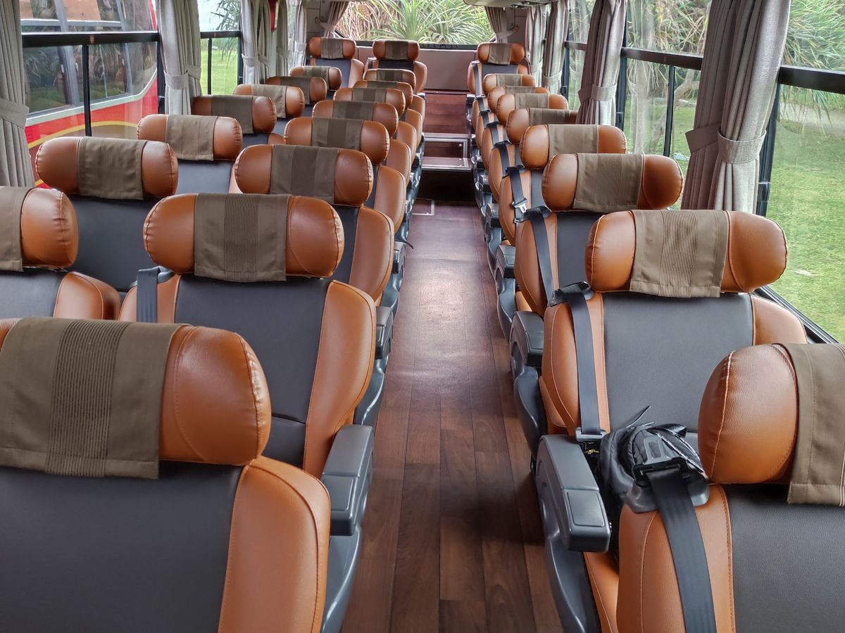 車両は、国内ではあまり見かけない韓国現代(Hyundai)自動車製のバスですが、3列掛けで、電源用のUSB端子や、Wi-Fiが装備されているなど、快適な席で、ゆったりと乗車させて頂きました。