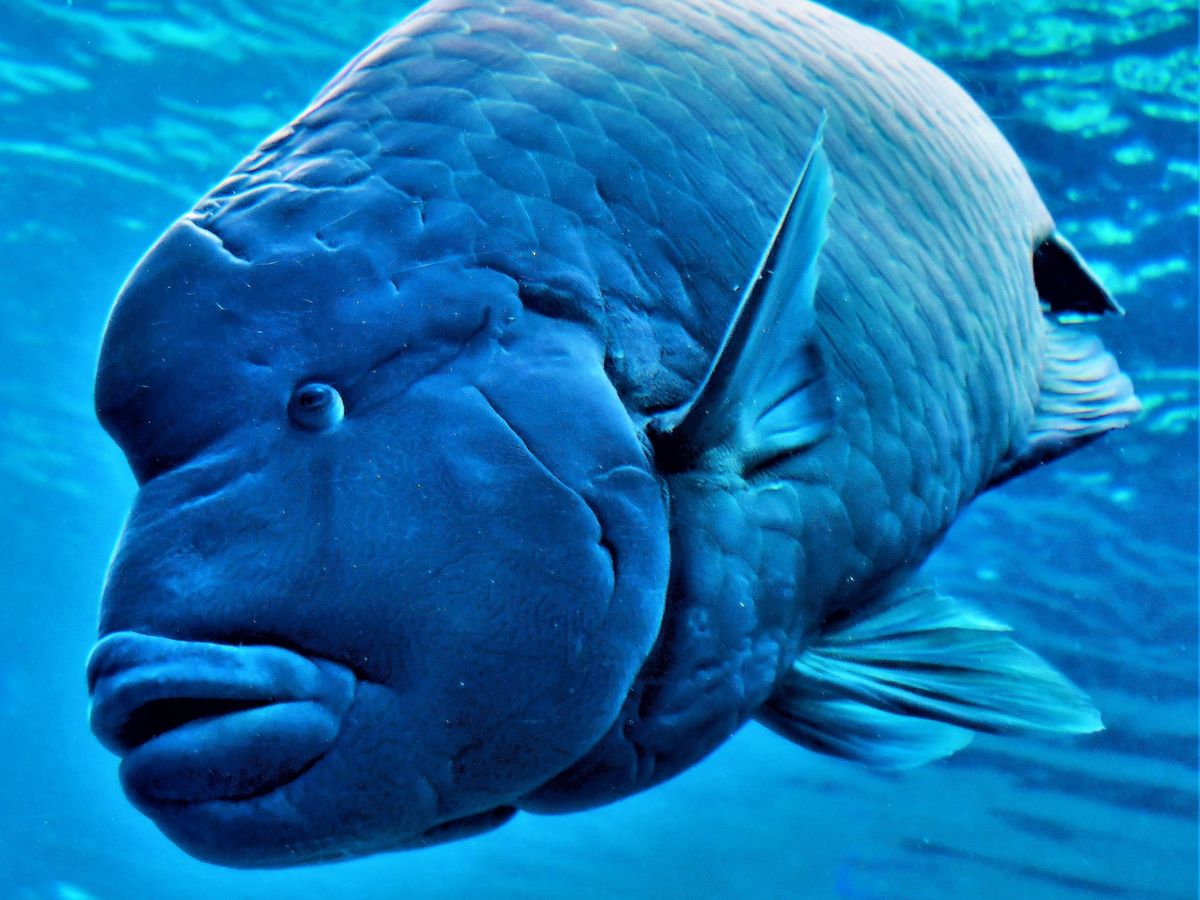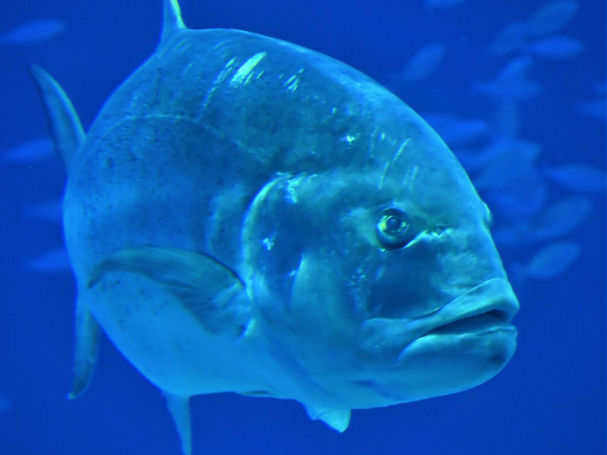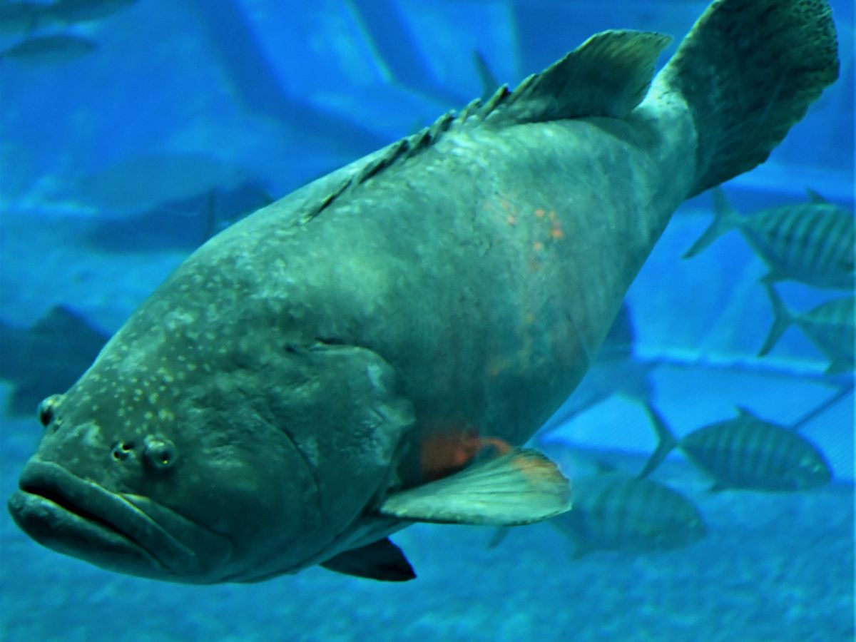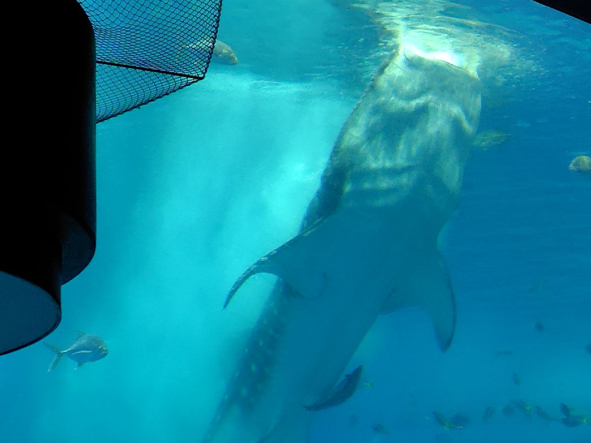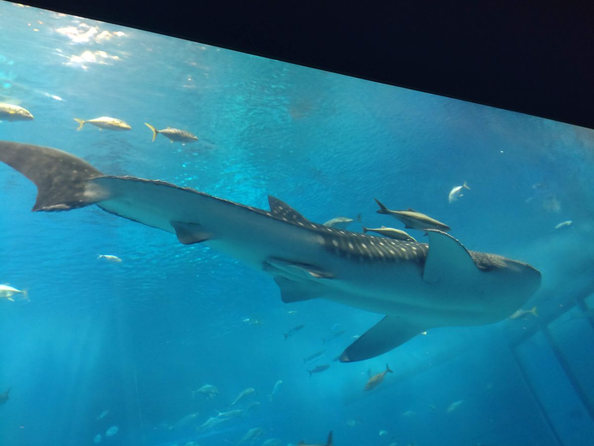 美ら海水族館の大水槽。ジンベイザメのスポットは混雑しいてます。しかし、ジンベイザメ以外にも表情豊かなお魚がいっぱいいます。