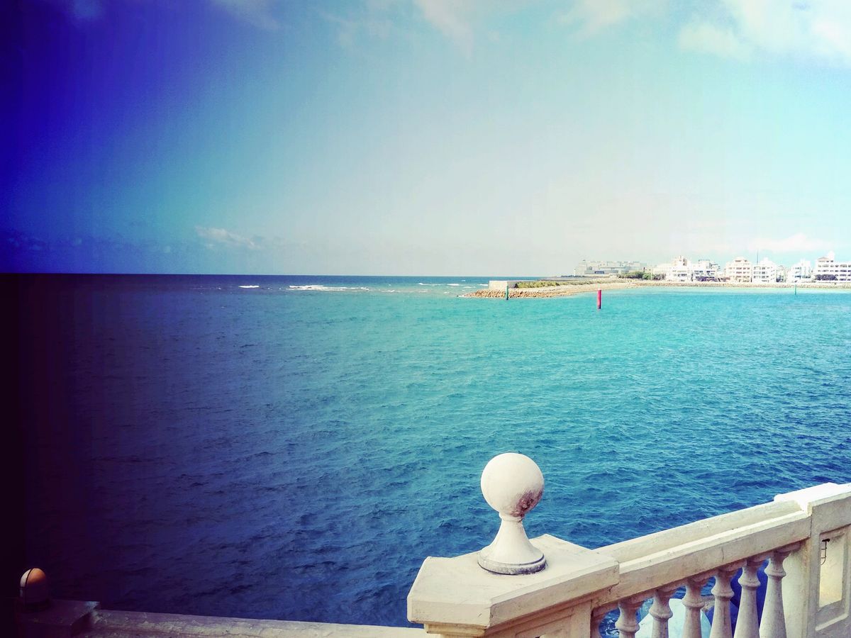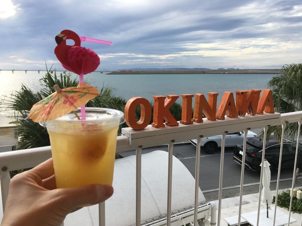 ウミカジテラスは海を見渡すようにおしゃれなショップ、南国カフェがたくさんあって、海を眺めながらシークヮーサーモヒートを楽しみました。
