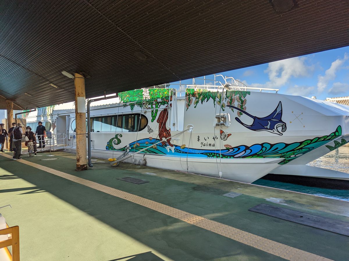 西表島まで行く船は思ったより大きかったです。二階の船上デッキ?のところが人気でしたが上の方が揺れるので酔いやすいかと思います。船酔いされる方は一回の方がおすすめです。