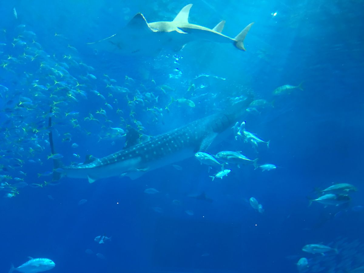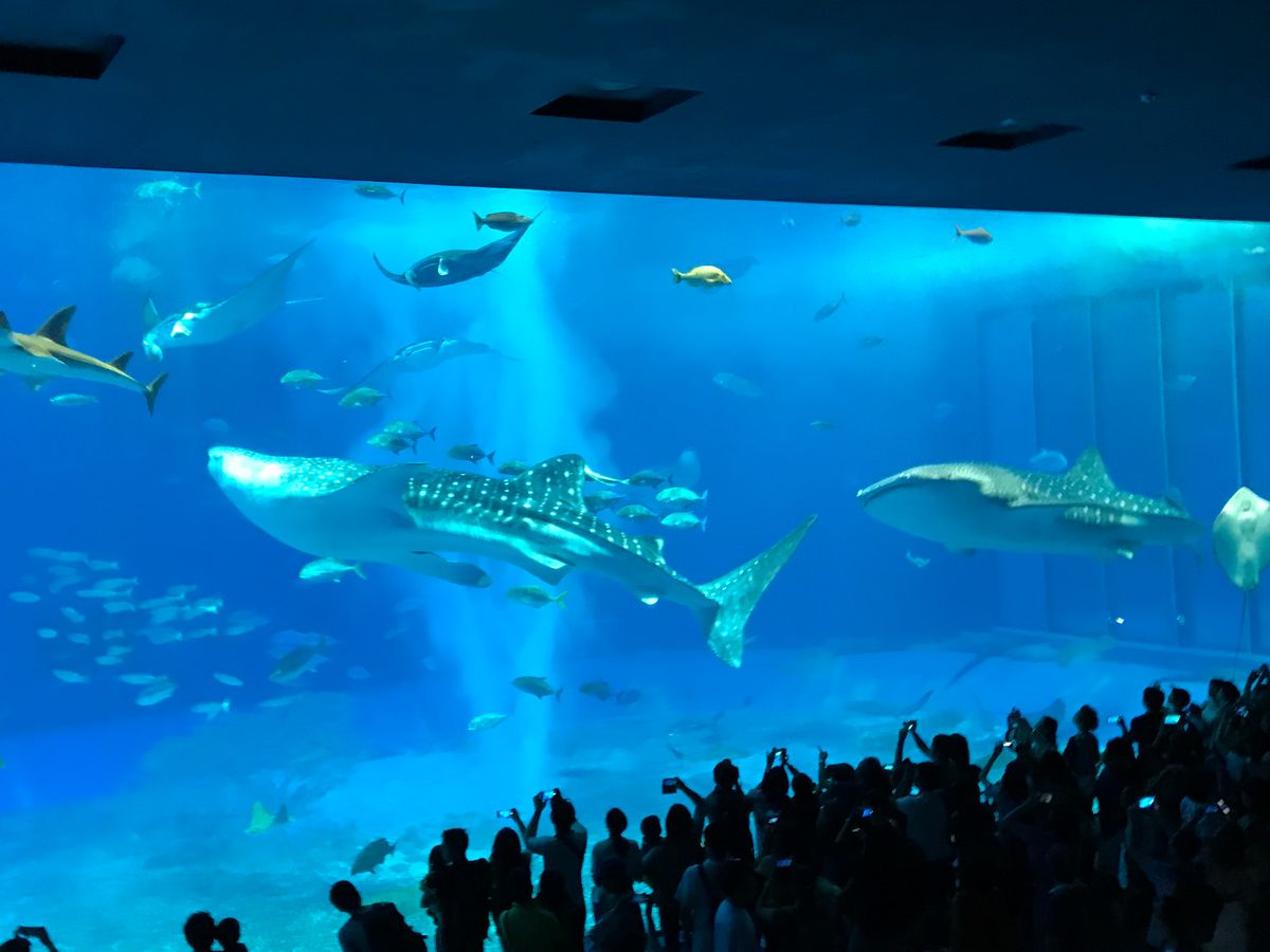 美ら海水族館の、巨大アクリルパネルの水槽で泳ぐジンベエザメや魚達には