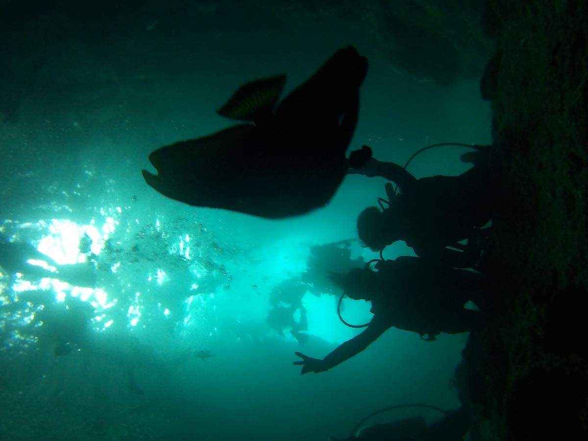 無事耳抜きができるようになるとお互いに満面の笑みでオッケーサイン!そして少しづつ深く潜っていき洞窟内へ。