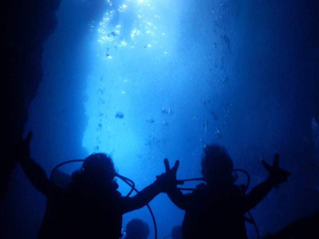 今回は青の洞窟の体験ダイビングに参加しましたが、真っ暗な洞窟を進んだり、たまに冷たい海流を通過したり、海の中から見る光はとても神秘的で、たくさんの魚と一緒に泳げましたし、餌をあげたら怖いくらい魚が集まりました。