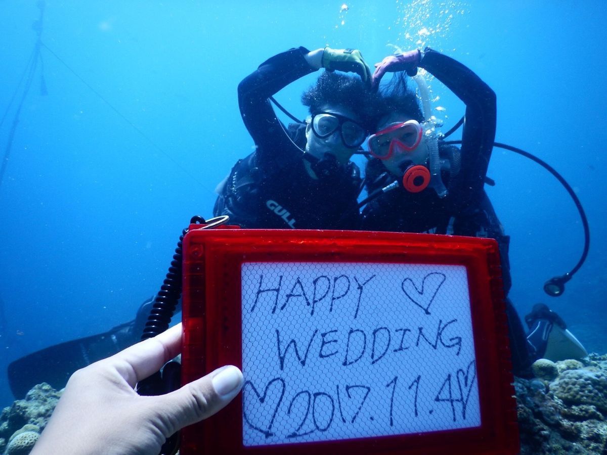 結婚式が近いと話したら、水中で結婚式用の写真を撮って下さいました。写真のサービスが無料だったり、温水シャワーにシャンプー等の備品、ドライヤーに脱水機まであって、こんなに快適なショップは初めてでした。また沖縄に行く機会があれば是非ぬるむーしさんでのツアーに参加したいですし、これから行かれる方にもめちゃおすすめです!!
