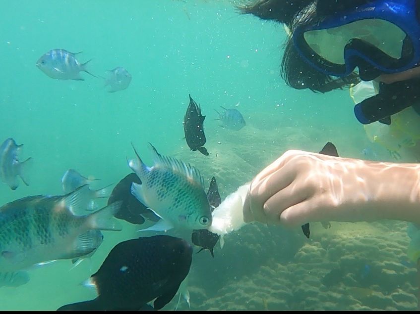 シュノーケルではたくさんの綺麗な魚が見られ餌やりも体験。