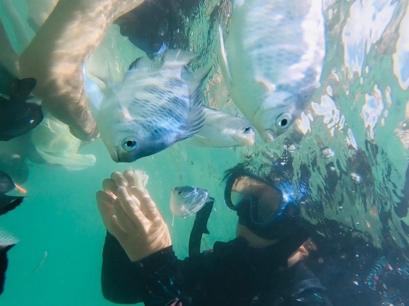 餌付けでたくさん魚が寄ってくるので、近くで魚を見ることができたことはこのツアーに参加して良かったと思いました!他の人も餌付けをしているのか魚はたくさんいます。