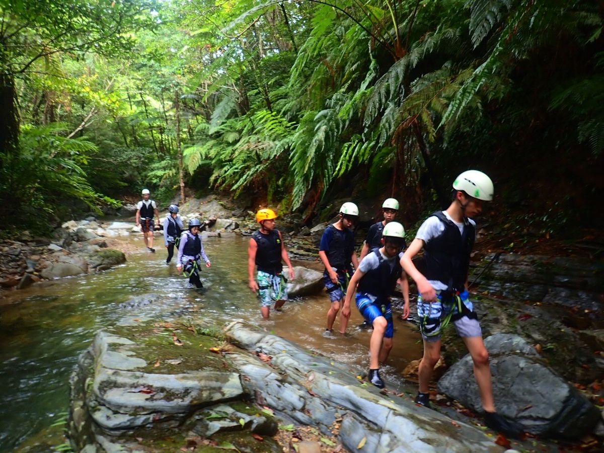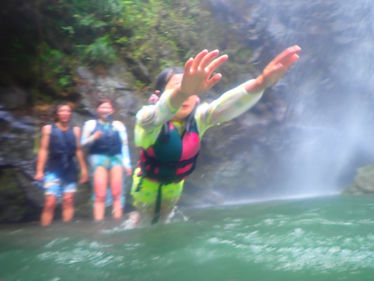 リバートレッキングでは深いところに向かってジャンプをしたり滝に打たれたり、海・やんばるの森・川と色々な表情の自然を満喫し、