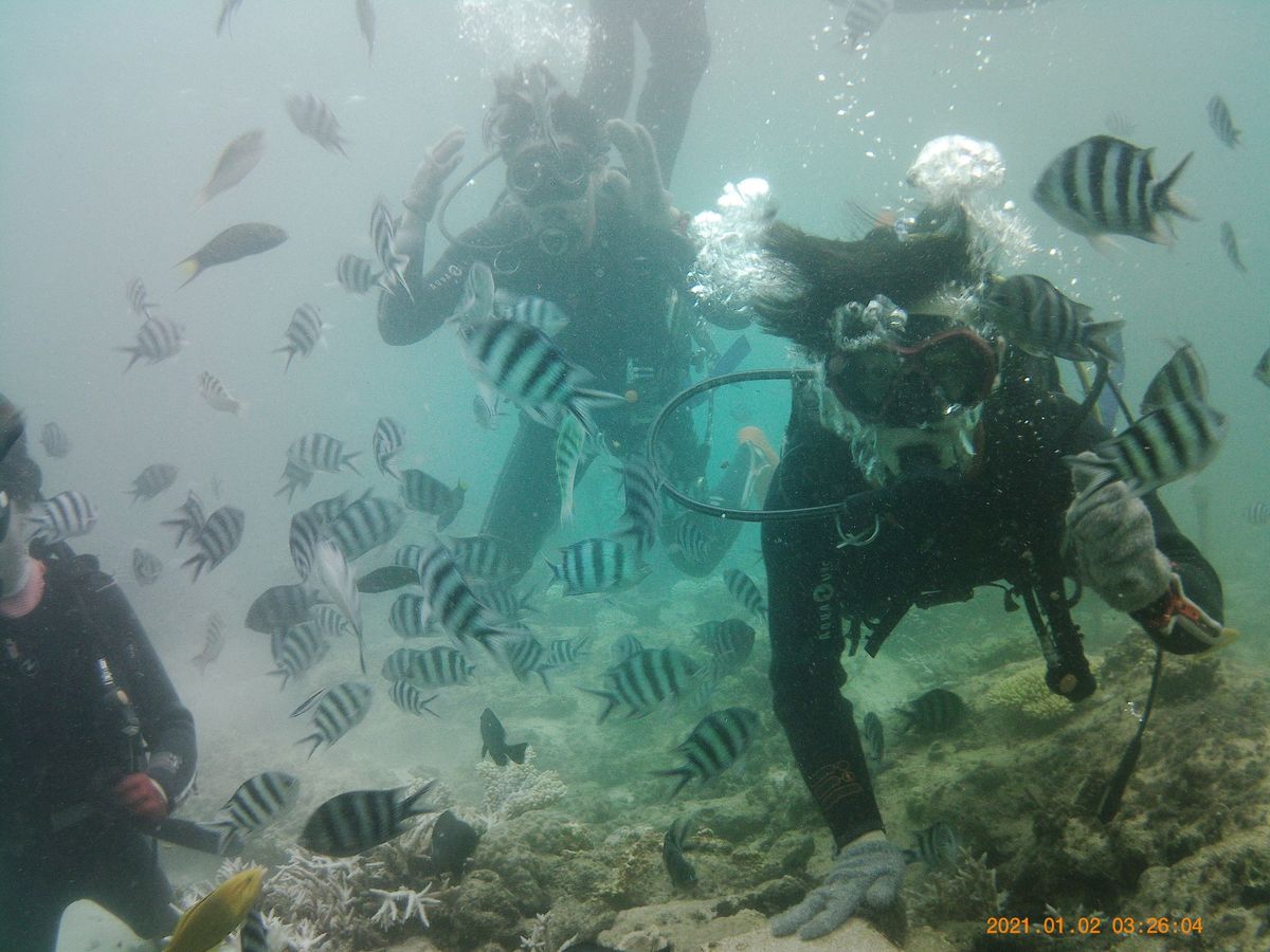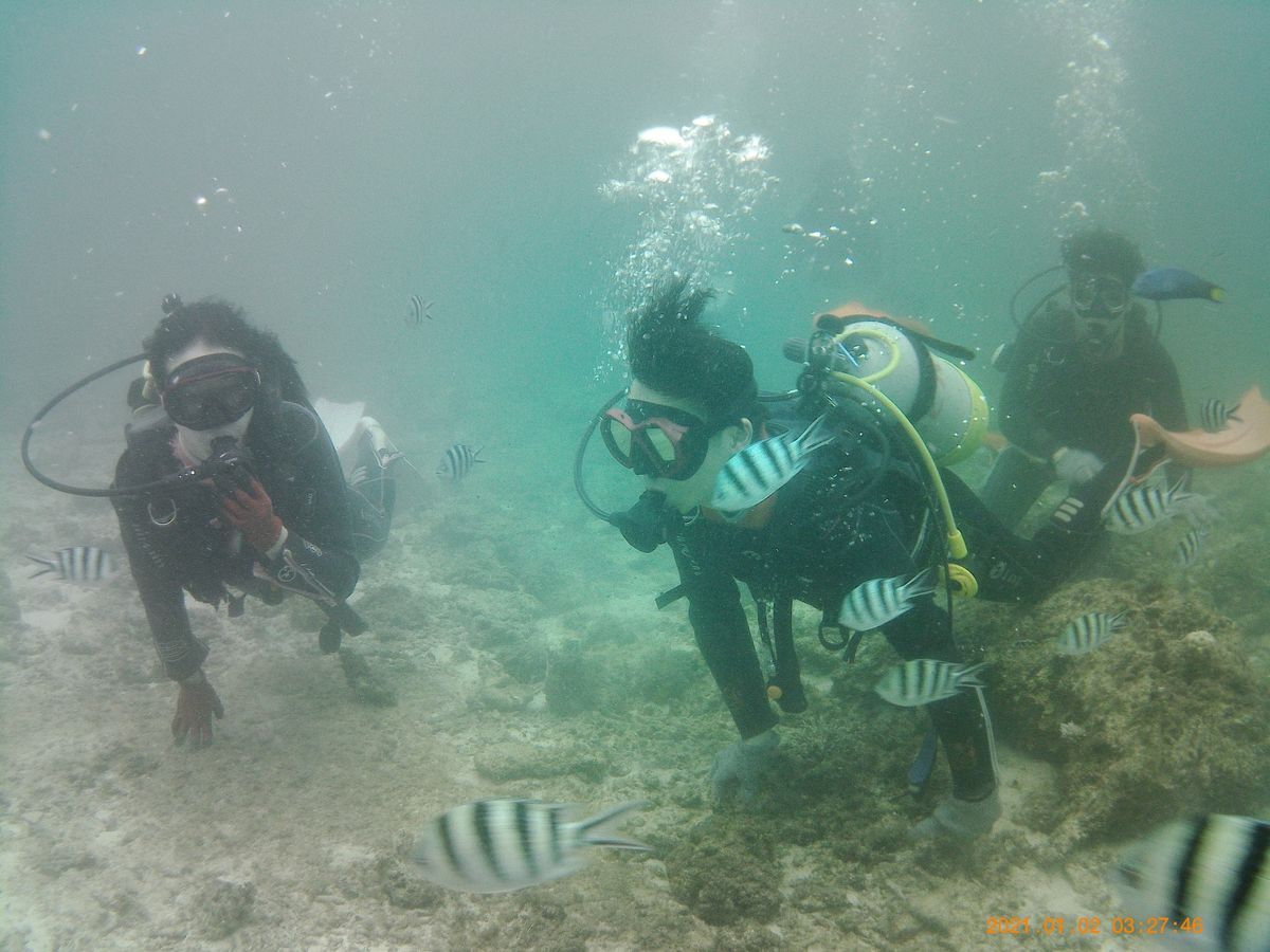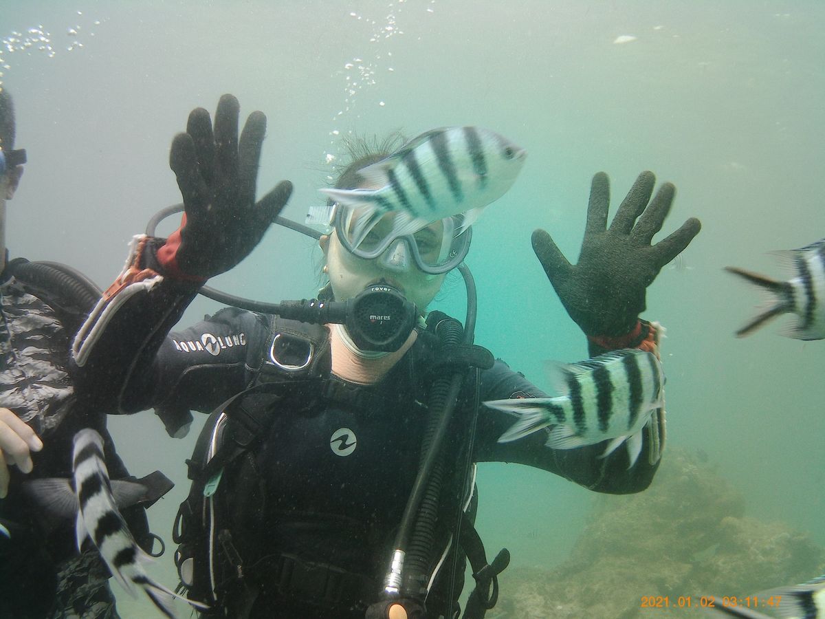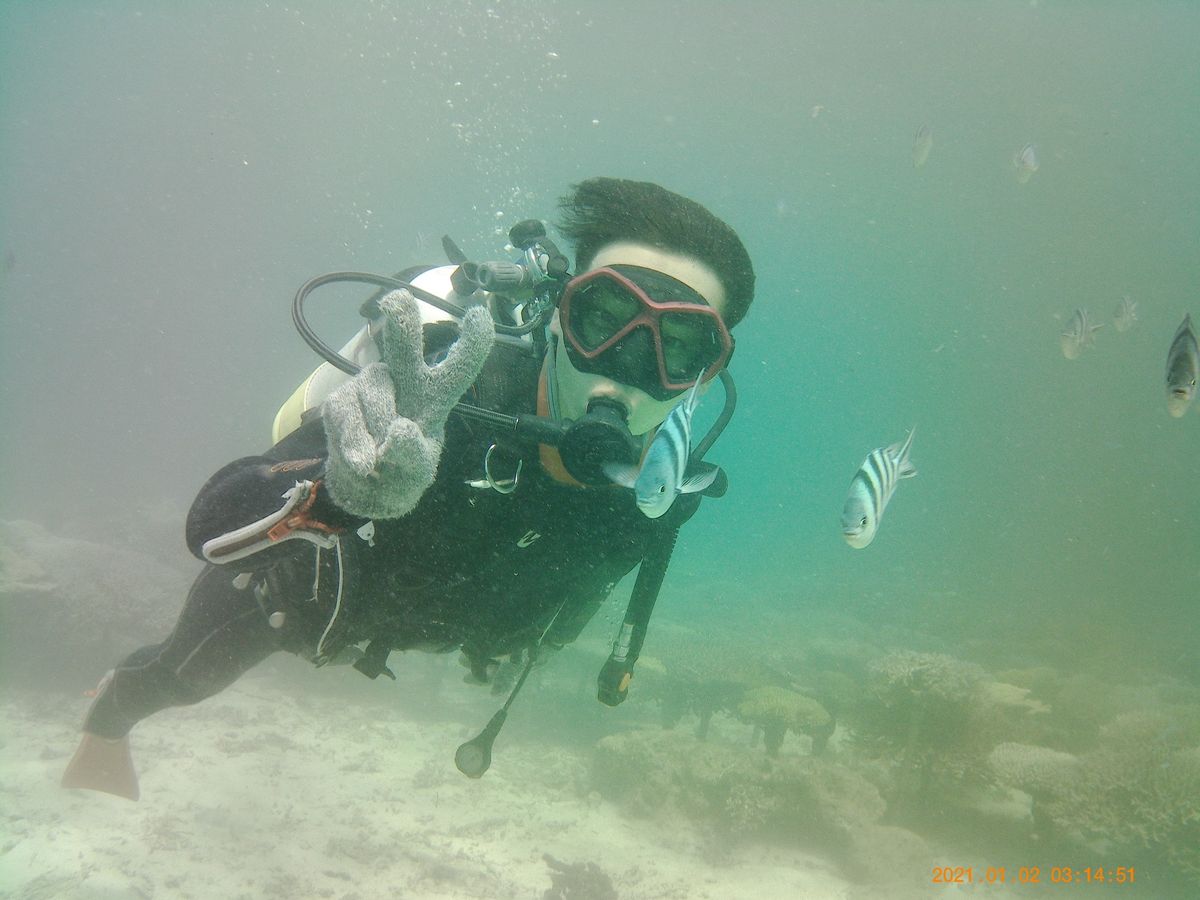 友人達とダイビング体験で皆んな初めてのダイビングだったので実際に潜るまでは楽しみ半分、事故の心配も半分という気持ちでした。