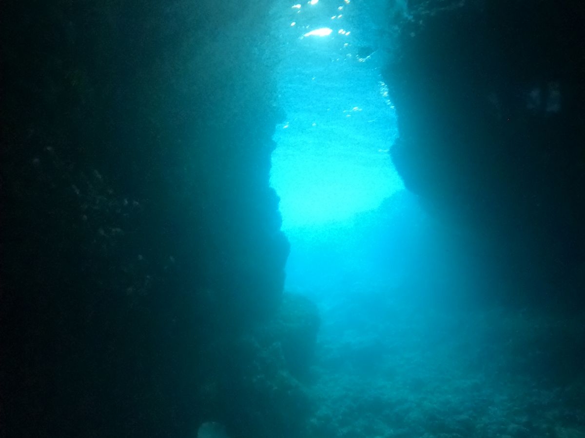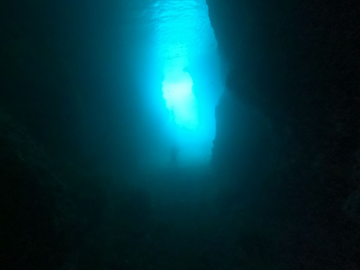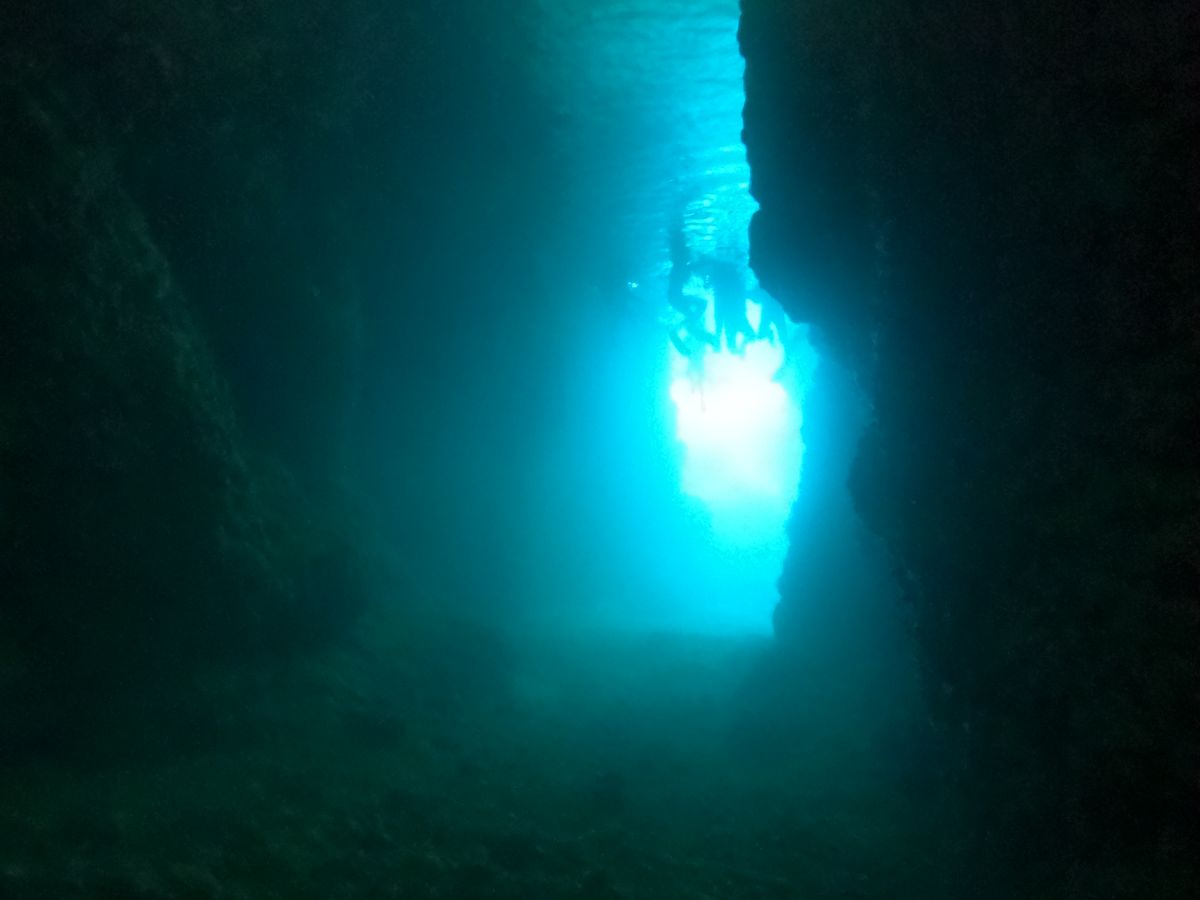 2回目は青の洞窟へのダイビングです。ここではインストラクターの方に着いて行く形で、青の洞窟を目指して進んでいきます。洞窟に近づくと光が少なくなり暗くなるので、インストラクターのライフジャケットに掴まりながら進みます。暗い中を進み、入口の方面を振り返ると、とても綺麗な青色の景色が広がっていました!これはかなり感動です。朝早かったこともあり、人が少なくとても綺麗に見えました!インストラクターの方々も朝イチがおすすめとのことでした。