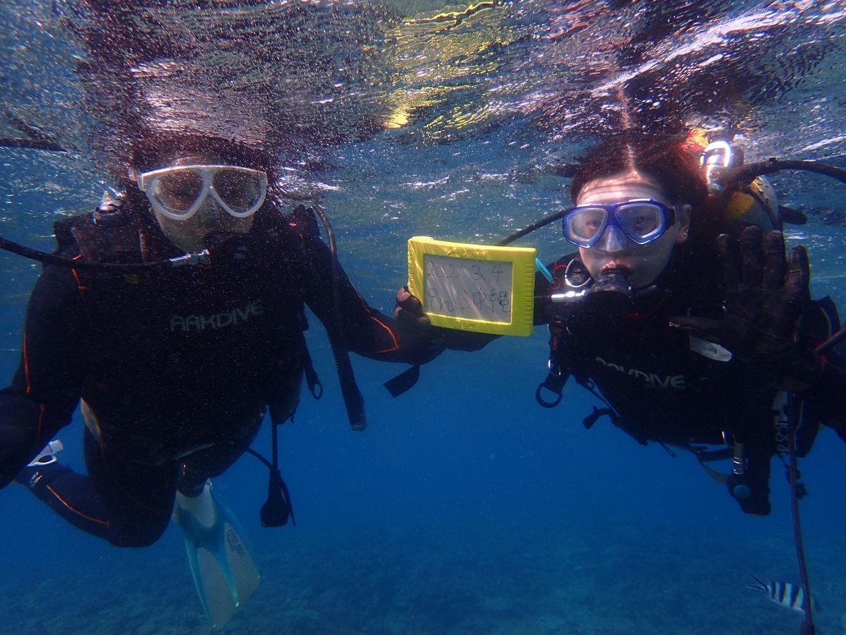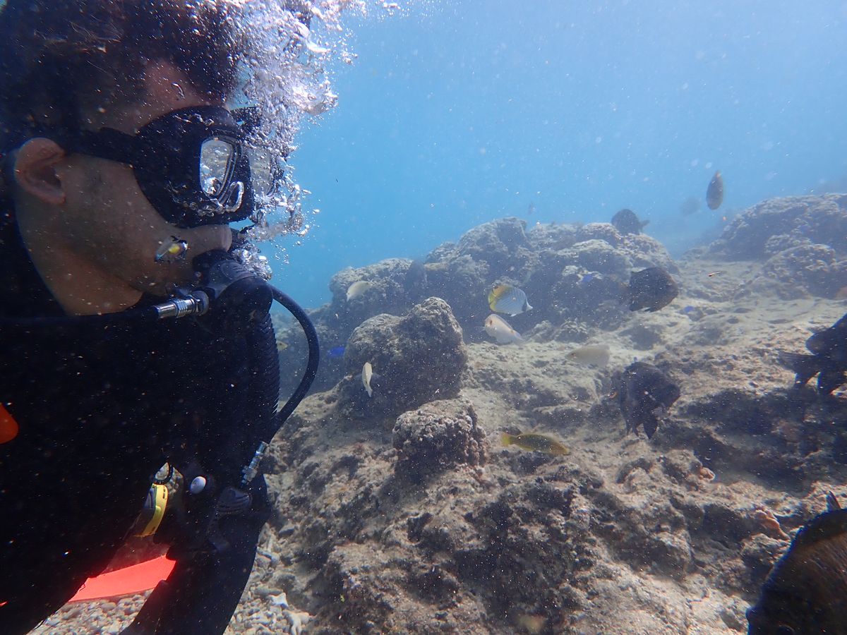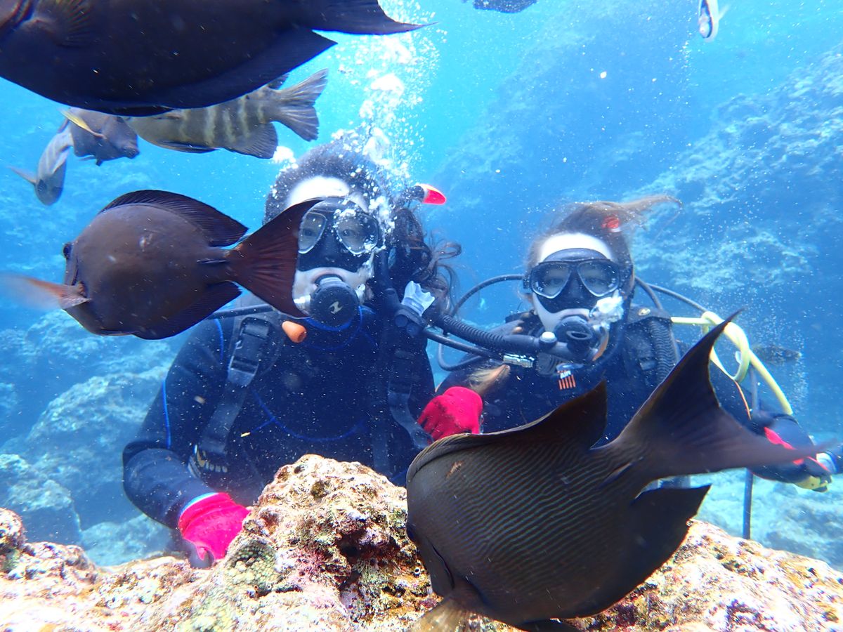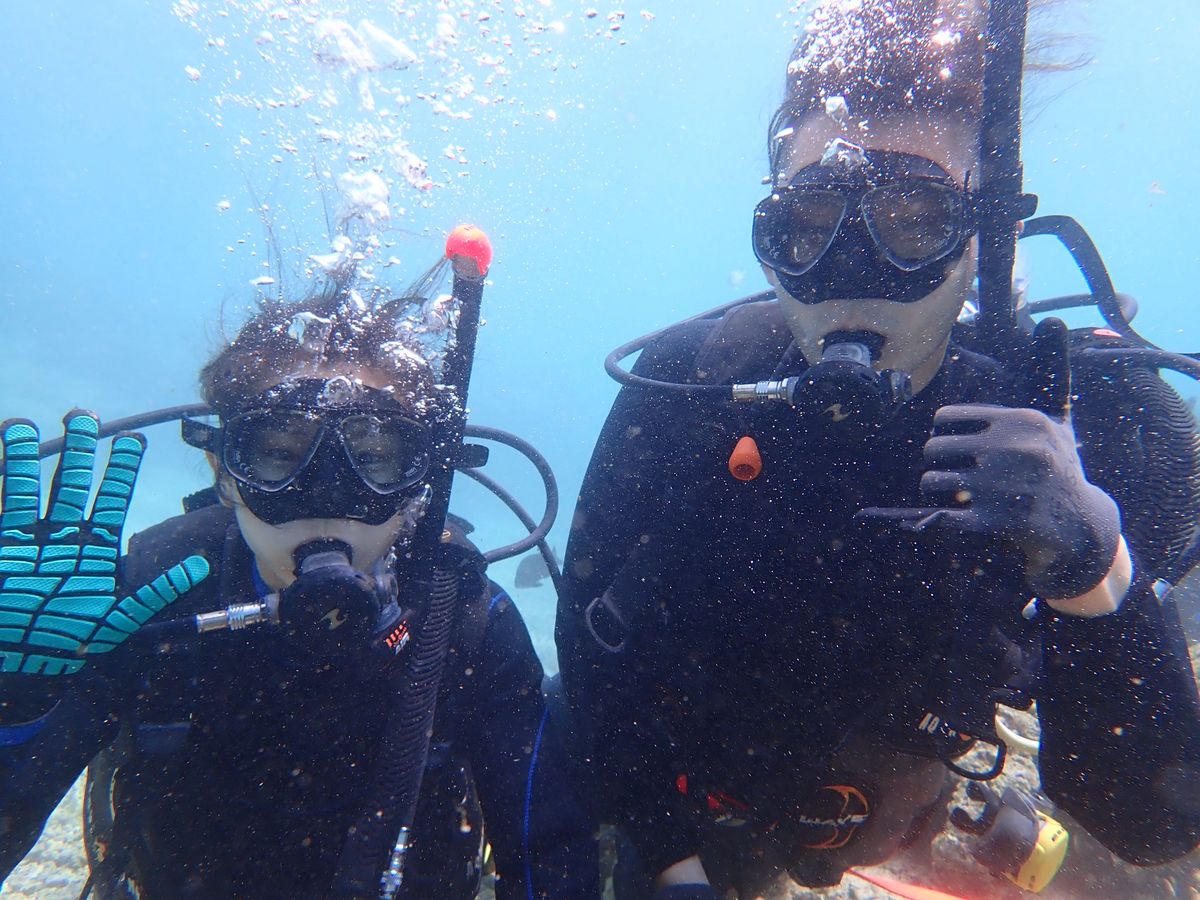 シュノーケルは経験ありで、ダイビングは初でした。説明とジェスチャーを教えてもらいいざ海に。2人に対して1人のスタッフさんがついてくださりとても安心でした。スタッフさんは皆気さくで話しやすかったです!楽しくて近くにいろんな魚がいました!やっと慣れてきたなと思った頃に終わりだったので潜っている時間はあっという間でした。