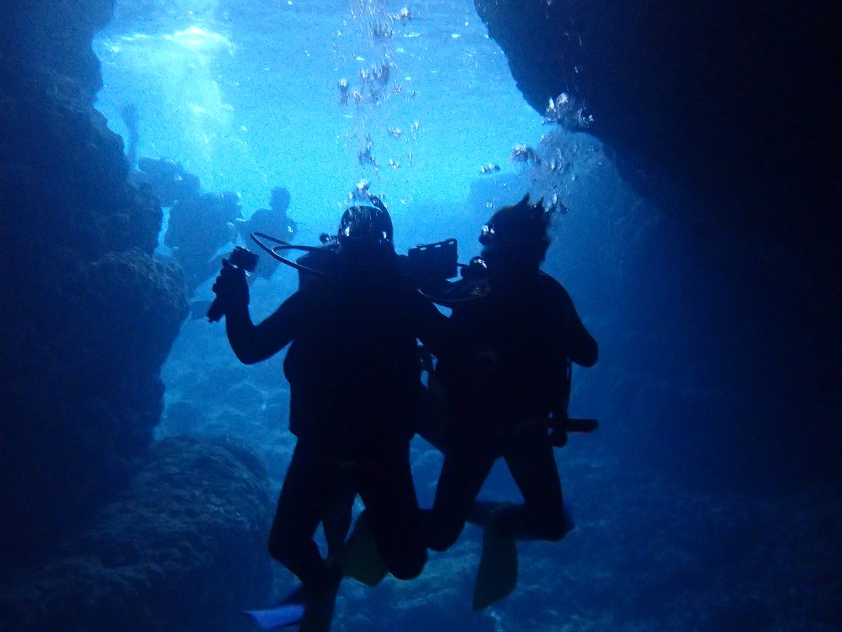 さすがの沖縄の海でした。潜った瞬間に、すぐそこに小魚がうようよといました。さらに潜ると、タコにも会うことができました。私は、久しぶりのダイビング体験で、彼女は初めてのダイビングで二人とも体が硬直気味でしたが、インストラクターさんの優しい対応・わかりやすい説明で青の洞窟を夢中で楽しむことができました。