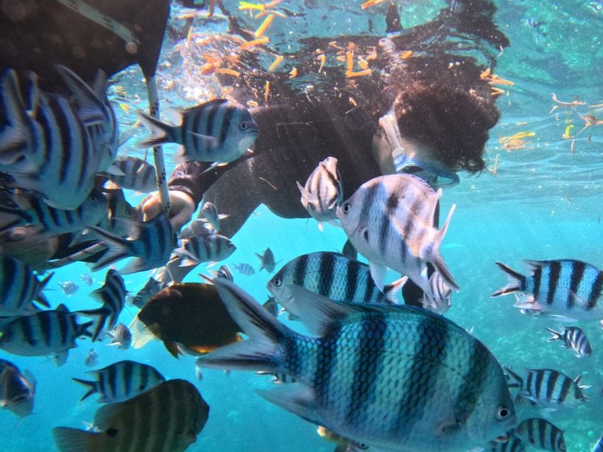 波も穏やかで殆どなく、ガイドさんが引いてくれる浮き輪につかまりバタ足をして海の覗くだけで、たくさんの美しい魚が見られました!写真撮影も何ヶ所かでしてくださいました。