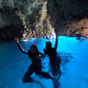 青の洞窟シュノーケリングイベントは天候のためキャンセルされましたが、ショップの近くの浅いエリアに連れて行ってくれることになり、たくさんの魚を見ることができました。流れは強かったですが、頑丈なライフジャケットのおかげで浮かんでいられましたし、ガイドの方もすぐそばにいて写真を撮ってくれました。また、休憩が必要な時には掴まることができるブギーボードも用意してくれました。もっと時間があれば、天候が落ち着いたら青の洞窟を再予約していたでしょう。ガイドの方は親切で助けてくれましたし、器材も清潔で良い状態でした。息子と私は素晴らしい時間を過ごしました。