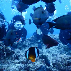 沖縄では年中を通してダイビングをすることができ、あそこのポイントでは年中色々なダイビングショップが体験ダイビングやシュノーケルツアーを開催しており「常に餌付けをされている状態」になっております。
