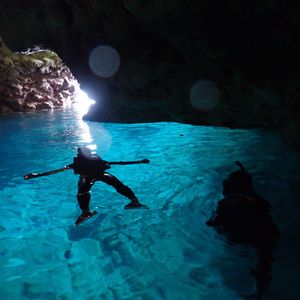 洞窟の入り口までボートで楽々アクセス!移動に時間がかからない分、幻想的な青の世界をたっぷりとお楽しみいただけます。 重いダイビング器材を背負って歩くこともないのでお子様のダイビングデビューにもおすすめです。雨、風の影響を受けにくく、比較的開催確率が高いのも人気の秘密です。